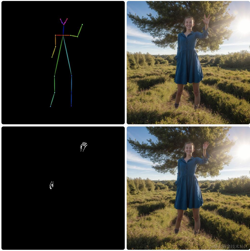 OpenPose 可以控制人体的姿态、面部的表情,有时候还能够解决坏手的问题(不要抱太大期望,下文会有介绍)。