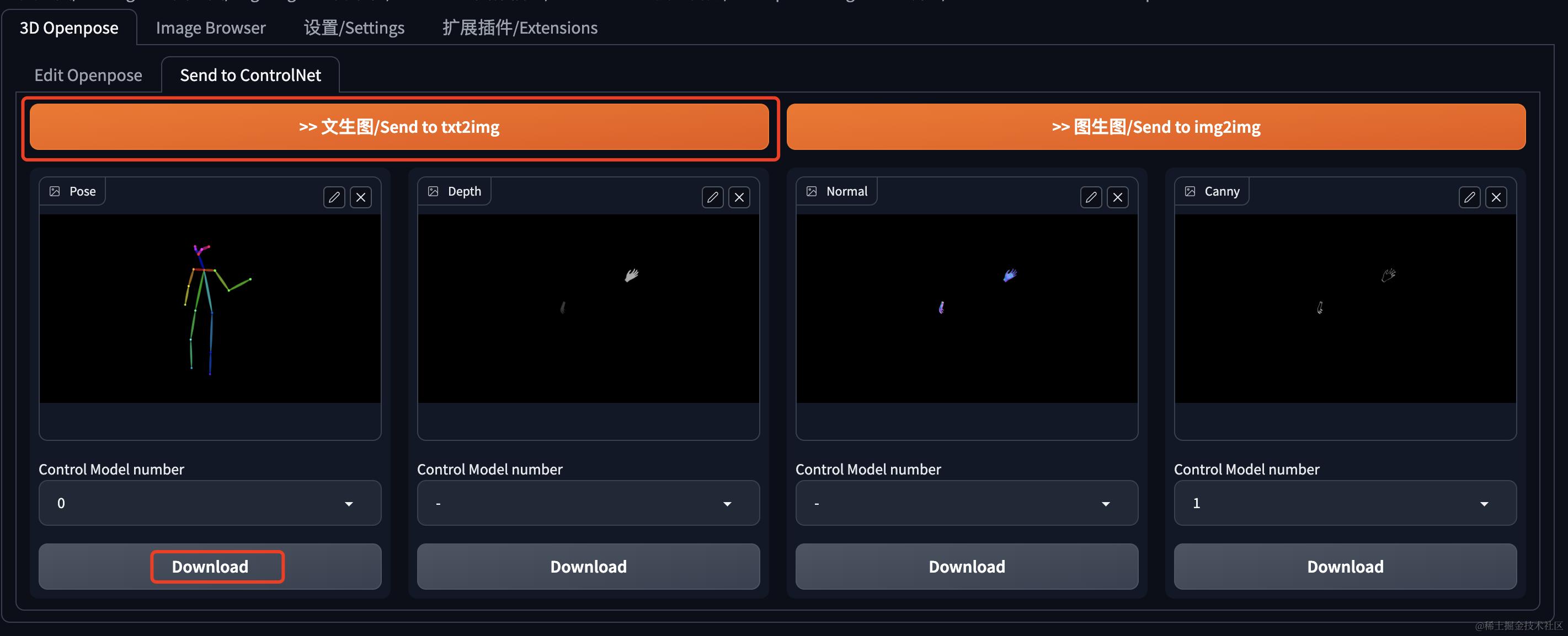 可以直接发送到文生图和图生图,也可以下载后备用。直接发送感觉不太好用,建议先下载再上传。ControlNet的设置方式和上文直接使用骨架图生成图片一样,注意不需要选择预处理器。
