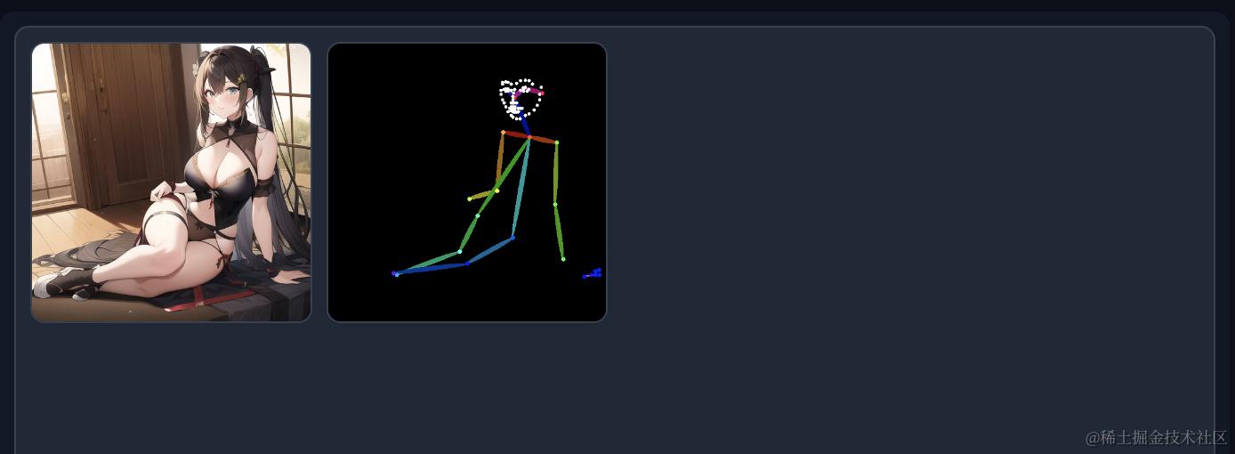 最后点击“生成”就等着出图吧。这里会输出两张图片,一张是使用大模型加OpenPose生成的图片,另一张是根据参考图片生成的骨架图,我们可以把这个骨架图复制出来,以后继续使用或者分享给别人使用。
