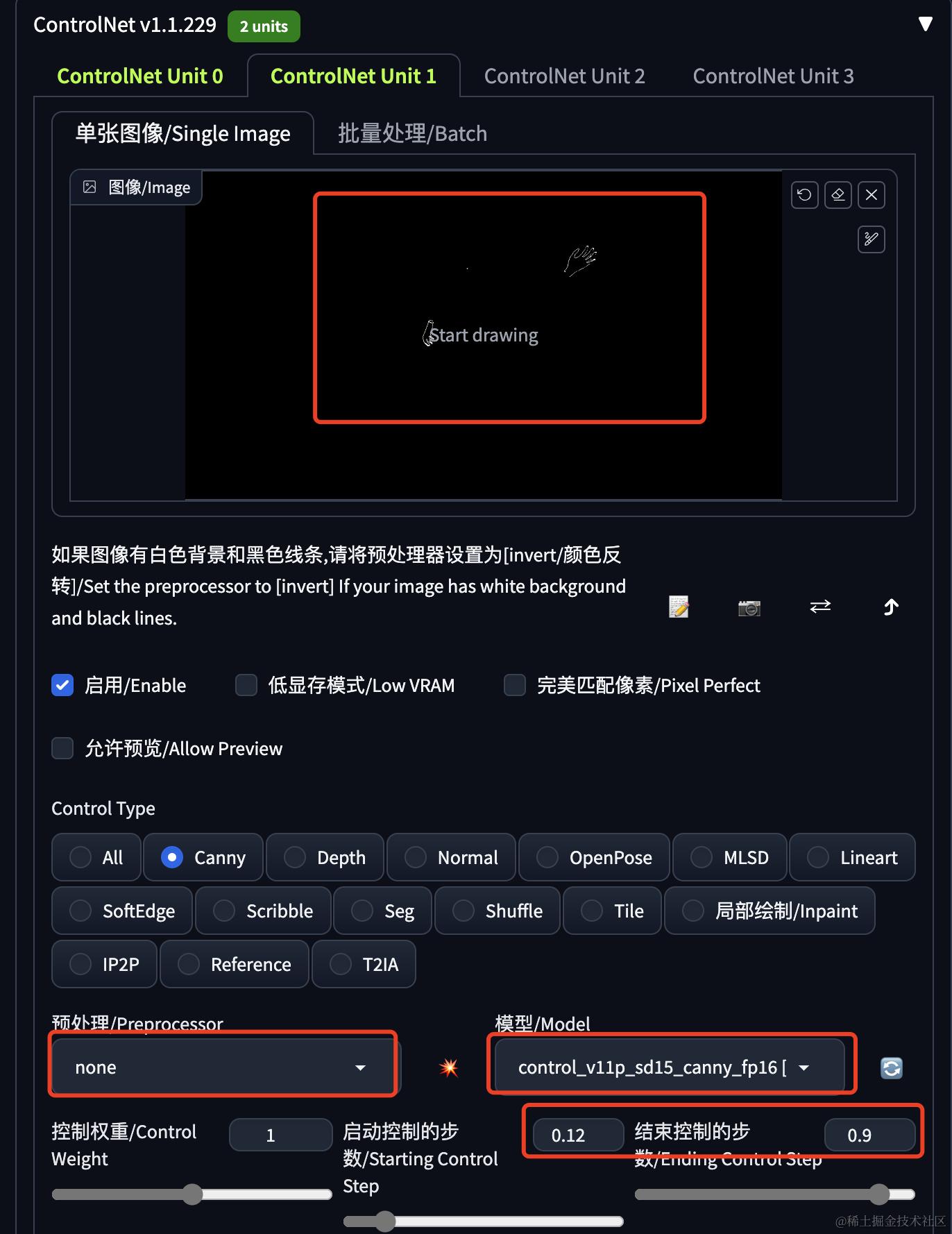 - 启用这个 ControNet 单元,一般选择图片后会自动勾选。