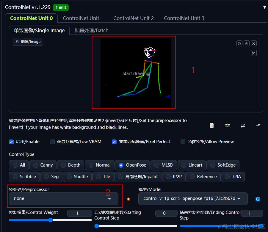 - 这里只需要设置1个 ControlNet 单元,选择第一个就行了。