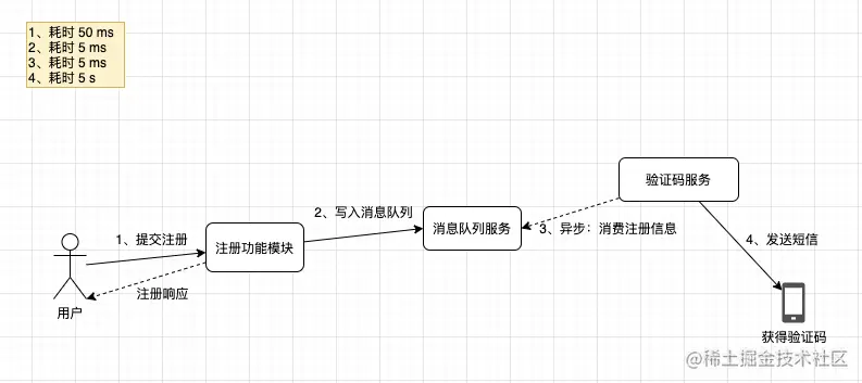 对于那些不需要实时响应的的业务,我们都可以放在消息队列中进行传输。下面是用户在进行系统注册的时候场景,充分体现MQ的作用