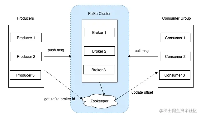 这边以kafka为例子,这是典型的集群模式,Kafka通过Zookeeper管理集群配置,选举leader,以及在Consumer Group发生变化时进行rebalance。Producer使用push模式将消息发布到broker,Consumer使用pull模式从broker订阅并消费消息。