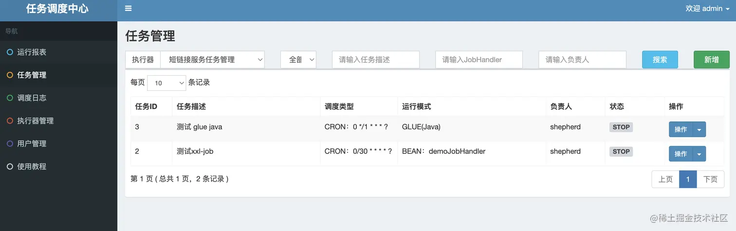 接下来就是在执行器下面创建任务JOB了,XXL-JOB支持创建很多种任务类型,如“Bean模式” 任务、“GLUE模式(Java)” 任务、GLUE模式(Shell) + GLUE模式(Python) + GLUE模式(PHP) + GLUE模式(NodeJS) + GLUE模式(Powershell),这里我演示Bean模式和GLUE模式(Java),其他模式自行查看官网