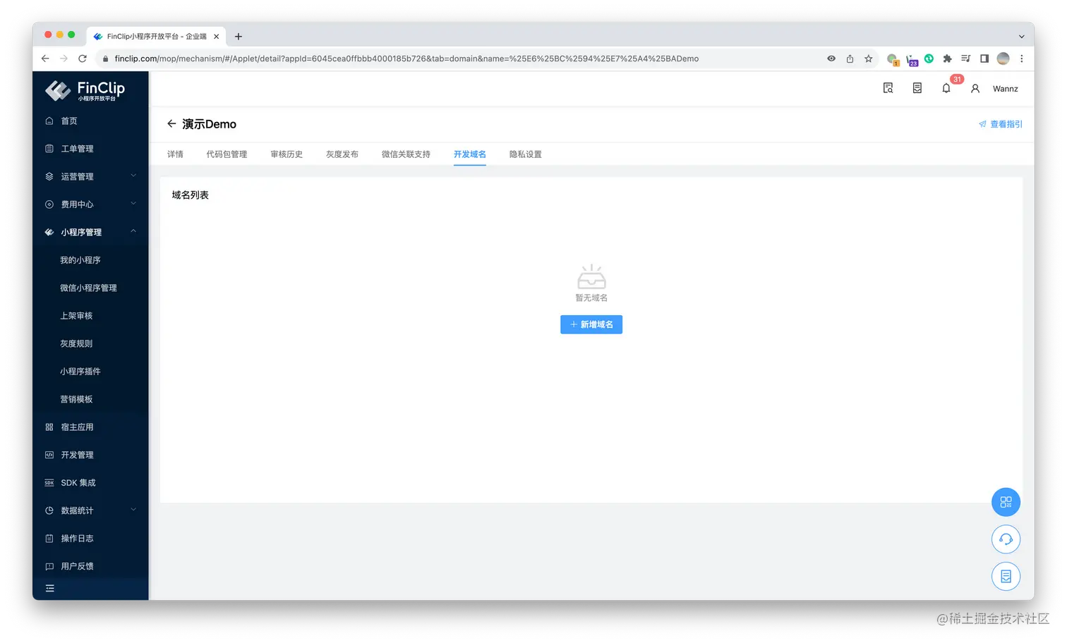 在新版本的 FinClip 产品之中,我们引入了「小程序维度」的域名配置功能。您可以针对每一个小程序独立配置需要访问的业务与服务器域名,助力您的高效开发与实现。