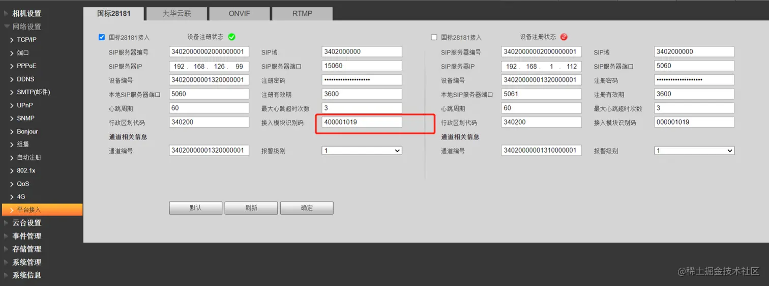 大华:关于大华公网设备对讲推荐使用大华TALK模式,这个功能在平台侧是支持的,会根据厂家名称,自动选择对讲信令模式,大华的TALK模式是大华自己扩展的国标协议,invite由平台侧主动发起,还有就是有的大华设备通过配置接入模块识别码,能修改数据传输模式,也是可以支持标准的国标对讲信令,如下:首位改为4