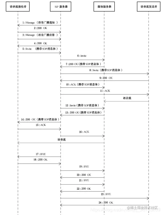 #广播通知 BroadCast #平台侧------->设备侧 MESSAGE sip:34020000001110000001@3402000000 SIP/2.0 From: <sip:34020000002000000001@3402000000>;tag=bccedfd000006 To: <sip:34020000001110000001@3402000000> Content-Length: 176 CSeq: 5 MESSAGE Route: <sip:34020000001110000001> Call-ID: 12345678900006 Via: SIP/2.0/UDP 192.168.1.101:5060;wlsscid=377aa9afcf1b36f;branch=123133532300006 Content-Type: Application/MANSCDP+xml Max-Forwards: 70 <?xml version="1.0"?> <Notify> <CmdType>Broadcast</CmdType> <SN>17298</SN> <!--语音输入设备的设备编码--> <SourceID>34020000002000000001</SourceID> <!--语音输出设备的设备编码--> <TargetID>34020000001370000001</TargetID> </Notify> #设备测收到广播通知回复200 ok #设备测------>平台侧 SIP/2.0 200 OK Via: SIP/2.0/UDP 192.168.1.101:5060;wlsscid=377aa9afcf1b36f;branch=123133532300006 From: <sip:34020000002000000001@3402000000>;tag=bccedfd000006 To: <sip:34020000001110000001@3402000000>;tag=880670885 Call-ID: 12345678900006 CSeq: 5 MESSAGE User-Agent: IP Camera Content-Length: 0 #设备测主动发起invite #设备测------>平台侧 INVITE sip:34020000002000000001@192.168.1.101:5060 SIP/2.0 Via: SIP/2.0/UDP 192.168.1.64:5060;rport;branch=z9hG4bK1490643408 From: <sip:34020000001110000001@192.168.1.64:5060>;tag=1499847265 // To: <sip:34020000002000000001@192.168.1.101:5060> Call-ID: 1420309512 CSeq: 20 INVITE Contact: <sip:34020000001110000001@192.168.1.64:5060> Content-Type: application/sdp Max-Forwards: 70 User-Agent: IP Camera # 媒体流发送者ID:发送方媒体流序列号,媒体流接收者ID:接收方媒体流序列号 Subject: 34020000002000000001:1,34020000001110000001:2 Content-Length: 214 v=0 o=34020000001110000001 2418 2418 IN IP4 192.168.1.64 s=Play c=IN IP4 192.168.1.64 t=0 0 # 音频 端口 RTP-over-UDP 负载类型( 8-PCMA, 96-PS) # 注意 这一步就是设备侧开的收语音流数据的端口 # RTP/AVP传输模式是udp,这种只能在局域网对讲 # TCP/RTP/AVP 这种才可以在公网对讲 m=audio 15062 RTP/AVP 8 96 a=recvonly # RTP + 音频流: 负载类型 a=rtpmap:8 PCMA/8000 a=rtpmap:96 PS/90000 # SSRC(同步信源标识符): SSRC值由媒体流发送设备所在的SIP监控域产生,作为媒体流的标识使用 y=0200000017 # v/编码格式/分辨率/帧率/码率类型/码率大小 a/编码格式/码率大小/采样率 # G.711 / 64kbps / 8kHz f=v/a/1/8/1