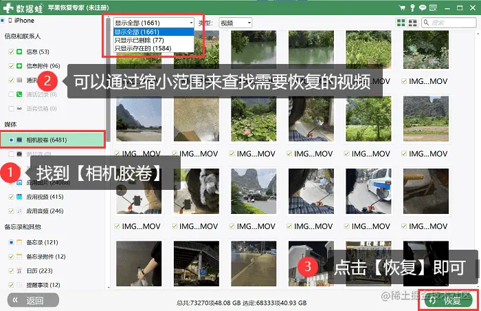 步骤2:待扫描完成后,在左侧菜单栏找到【相机胶卷】文件夹,选中需要恢复的视频,然后点击【恢复】即可。