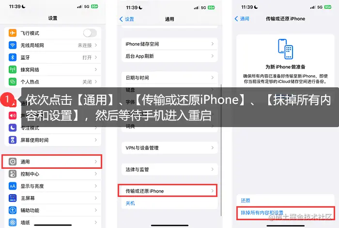 步骤2:在【通用】界面选择【传输或还原iPhone】,然后选择页面下方的【抹掉所有内容和设置】。
