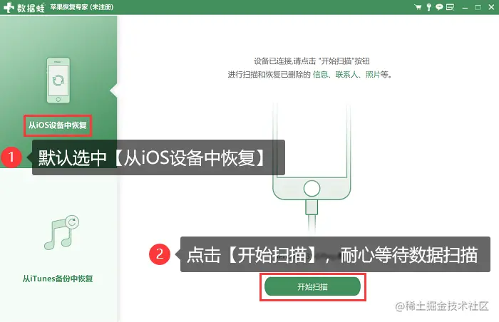 步骤2:在【从iOS设备中恢复】页面中点击【开始扫描】。