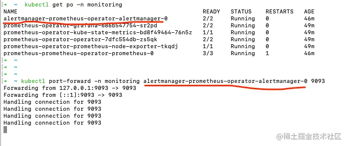 kubectl port-forward -n monitoring alertmanager-prometheus-operator-alertmanager-0 9093