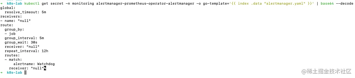 kubectl get secret -n monitoring alertmanager-prometheus-operator-alertmanager -o go-template='左括号 左括号 index .data "alertmanager.yaml" 右括号 右括号' | base64 --decode (把汉字替换为对应符号,不这样hexo会解析出错)