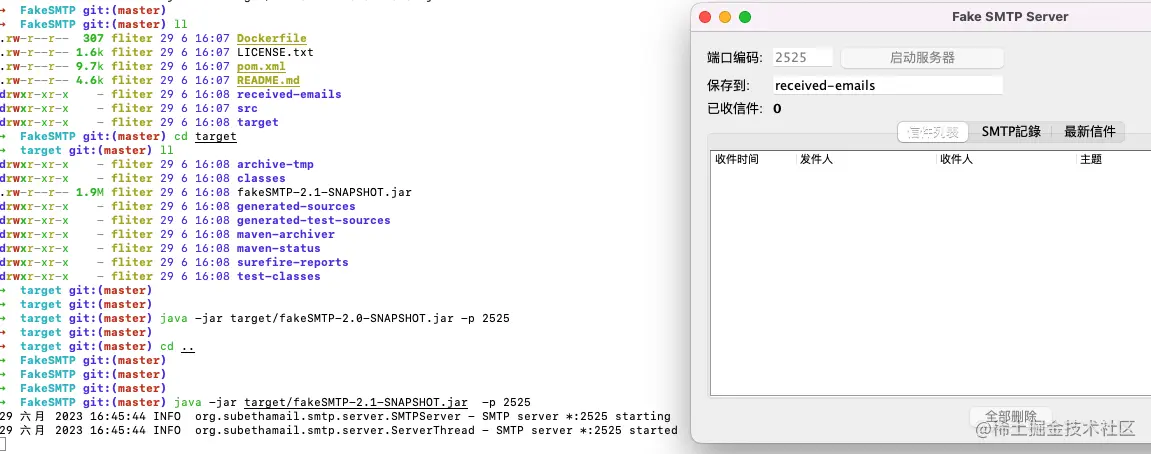 现在需要改为 java -jar target/fakeSMTP-2.1-SNAPSHOT.jar -p 2525