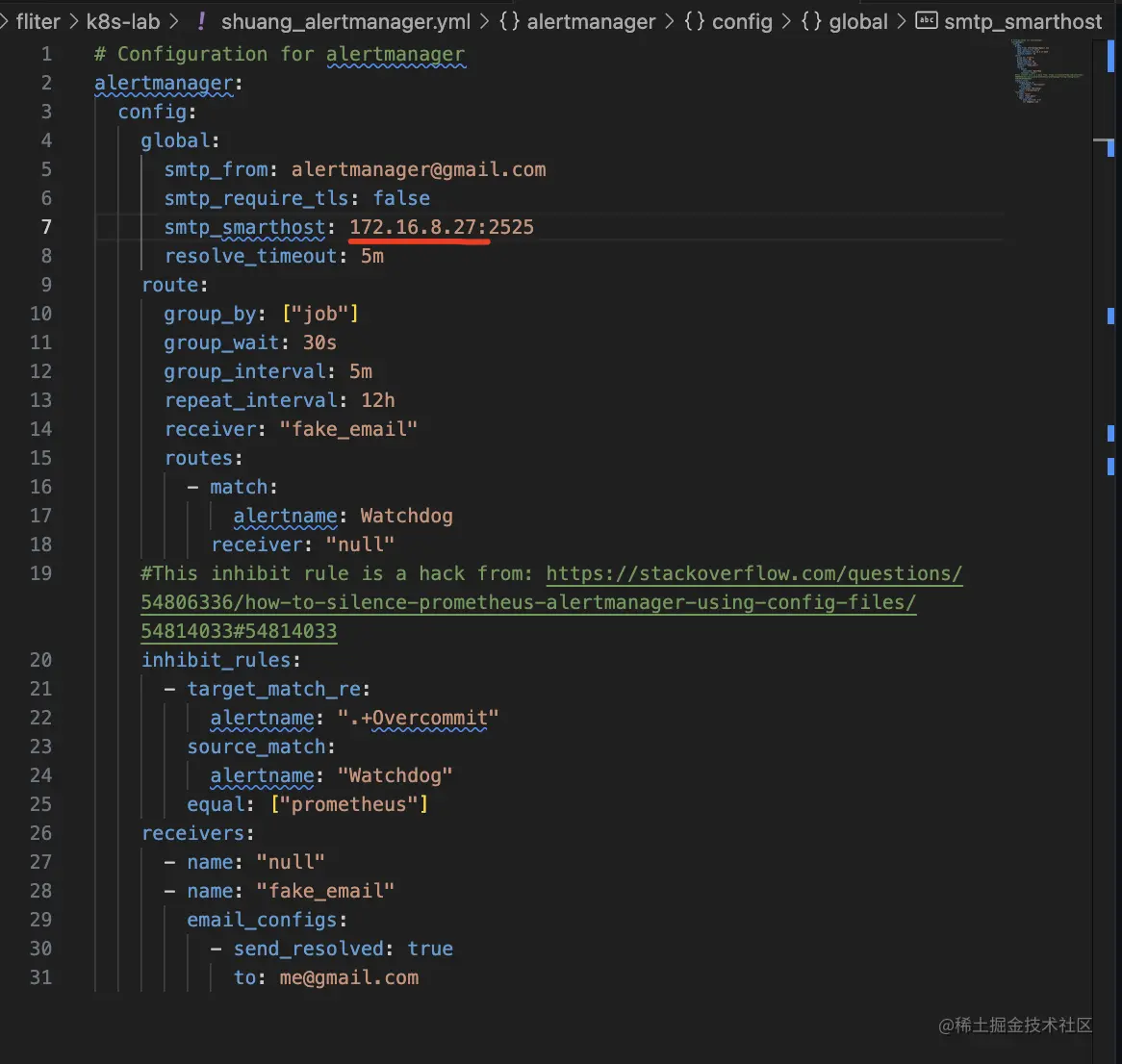 换句话说,这个命令的目的是获取监控系统中 Alertmanager 的配置文件,并将其解码为可读的 YAML 格式,以便查看其中的配置详细信息。