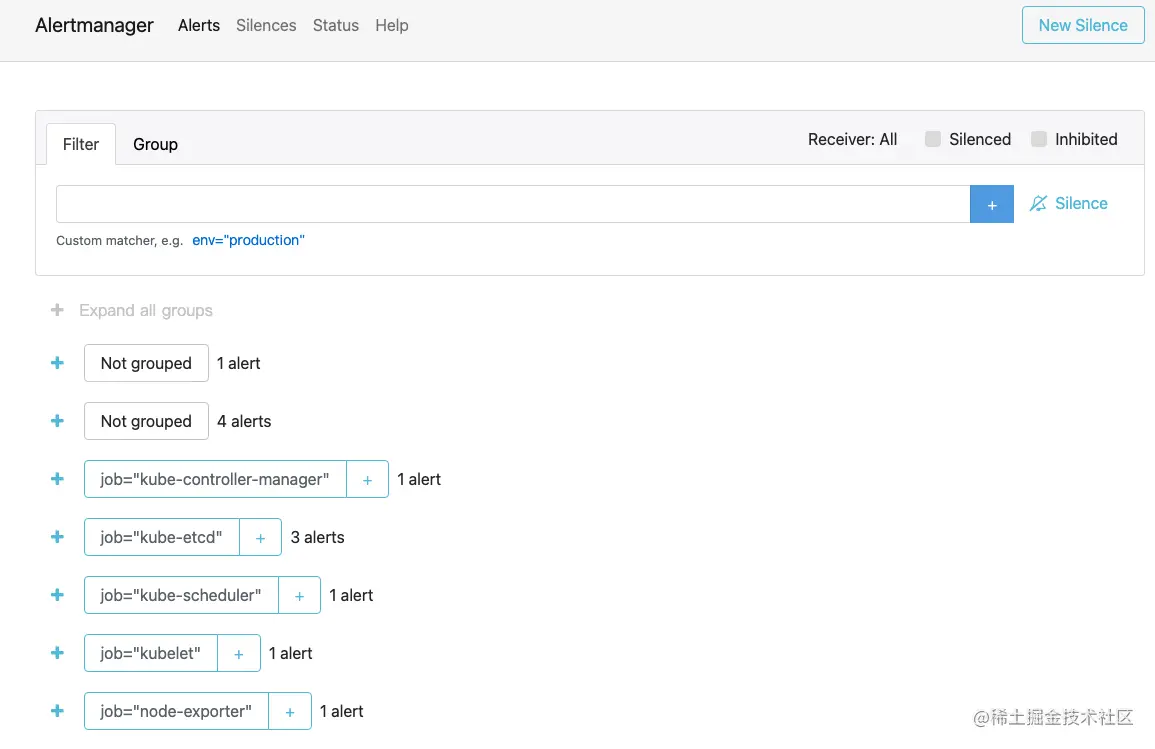 上述示例中的静默规则指定了在警报的严重性为critical,并且警报名称和服务名称相同时,将通知发送给null,即静默该警报。