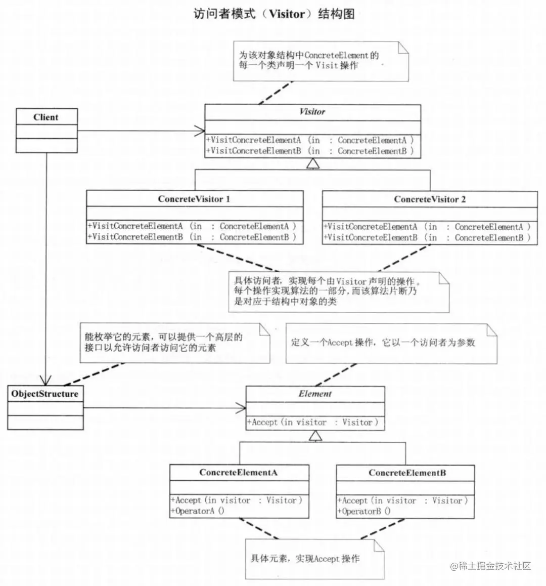 - 优点:实现双分派机制,通过在ConcreteElement.Accept中传递this来调用visit(多态+重载时使用动态绑定)。