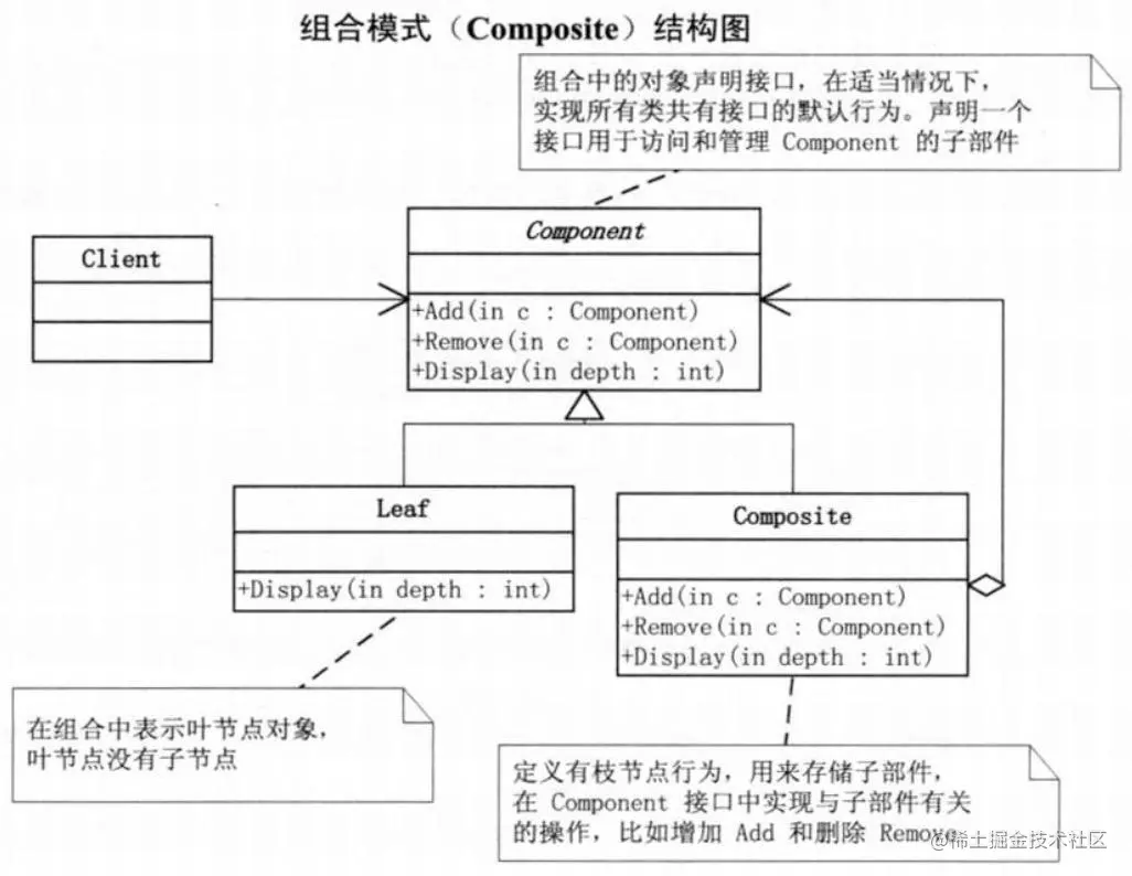 安全模式:Component中不声明Add/Remove方法,而在Composite中声明;客户端调用时需要判断。