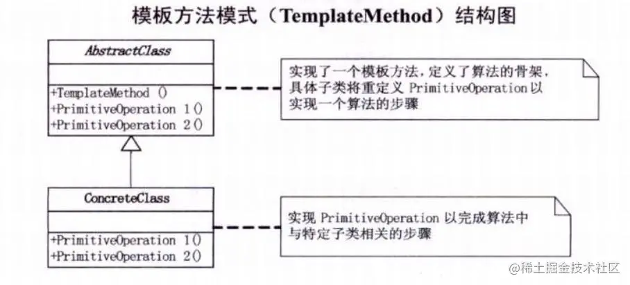 定义一个操作中算法的骨架,而将一些步骤延迟到子类中。使得子类可以不改变一个算法的结构即可重定义该算法的某些特定步骤。