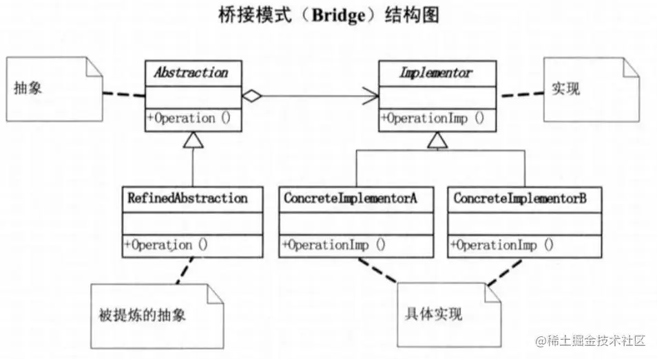 将抽象部分与它的实现部分分离,使它们都可以独立地变化。(优先使用组合/聚合,而不是类继承)
