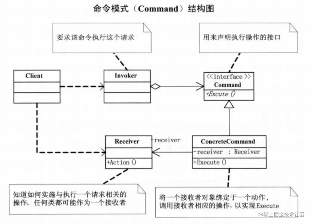 - 优点:把请求一个操作的对象与知道怎么执行操作的对象分隔开(请求者与接收者之间解耦)