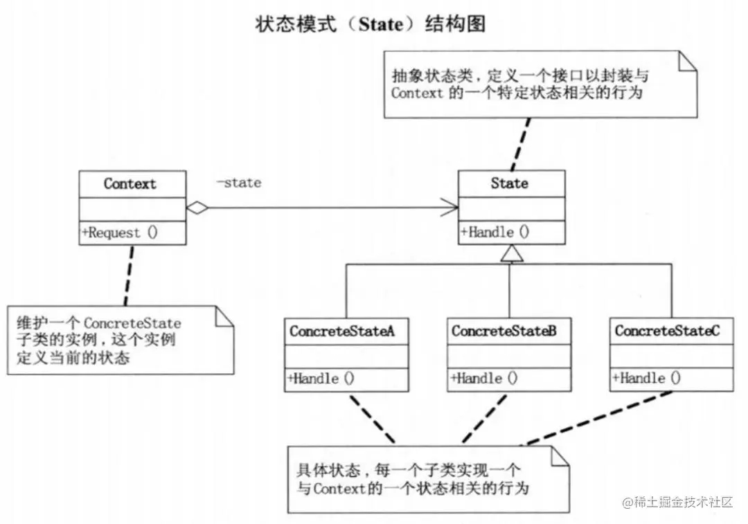 - 优点:封装了状态转换规则,消除庞大的条件分支语句,把状态转移逻辑分布到状态子类之间
