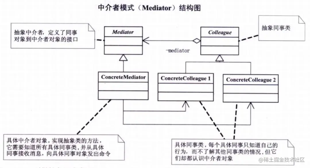- 缺点:具体中介者类中包含了大量同事之间的交互细节,可能会导致其很复杂,难以维护