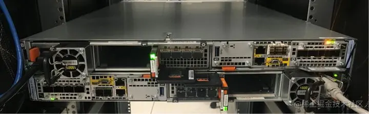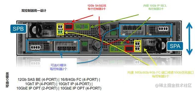 这其中控制器是最复杂(无论是硬件还是软件),也是成本最高的部件。如下图是EMC Unity系列存储的控制器后端,可以发现控制器包含很多部件,比如电源模块和各种端口,其中端口分为前端端口和后端端口。后端端口用来连接硬盘扩展柜的,而前端端口则是用来接收计算节点访问的。