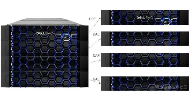 企业级磁盘阵列是由一组设备构成的存储系统,主要包括两种类型的设备,分别是控制器和扩展柜,其中控制器只有一台,扩展柜可以没有,也可以有多台。在EMC的Unity中分别称为DPE(Disk Processor Enclosure)和DAE(Disk Array Enclosure),在华为的OceanStor里面称为控制框和硬盘框。