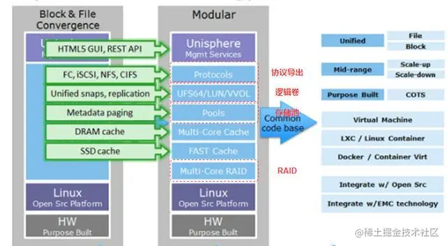 对于软件架构,可以从EMC公布的关于Unity的软件栈获取一些信息,可以看出其整体实现逻辑与IBM V7000是一致的。其实大多数存储厂商的软件栈大体都是这样的,只是实现细节可能略有不同。