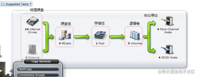 对于其基本功能,IBM V7000的管理界面可以比较清晰的加以说明。如下图是V7000的管理界面,在该界面中最左侧的是物理硬盘,包括控制器内置硬盘和扩展柜的硬盘。然后是硬盘组,硬盘组将若干硬盘化成一组,并通过相应的算法实现数据冗余保护,一般是RAID。接着是多个硬盘组构建成一个存储池。在存储池的基础上可以根据用户的需要划分逻辑卷,并通过协议导出给计算节点使用。