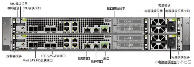 其实业界存储系统的设计普遍采用这种双控制器、可插拔部件的方式。如下是华为存储的后端视图,在一个机箱里面有两个独立的控制器,电源模块可插拔,通过拉手可以将电源模块拉出。IO模块和BBU也是可以独立拉出的。