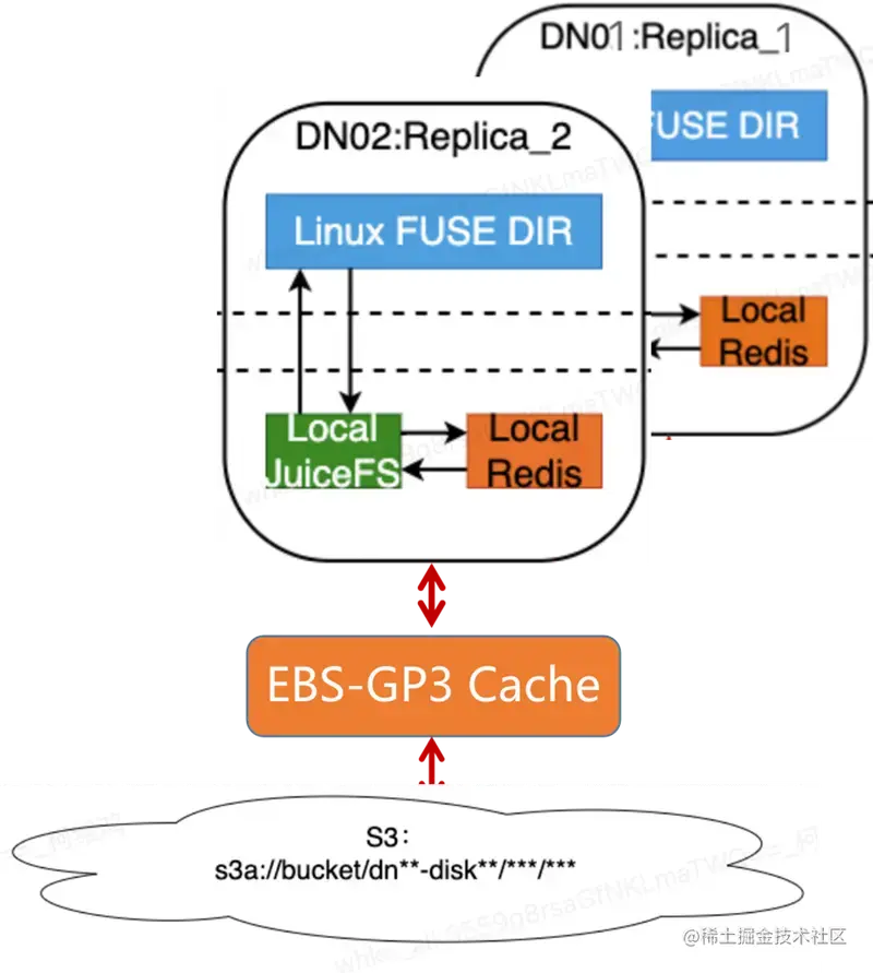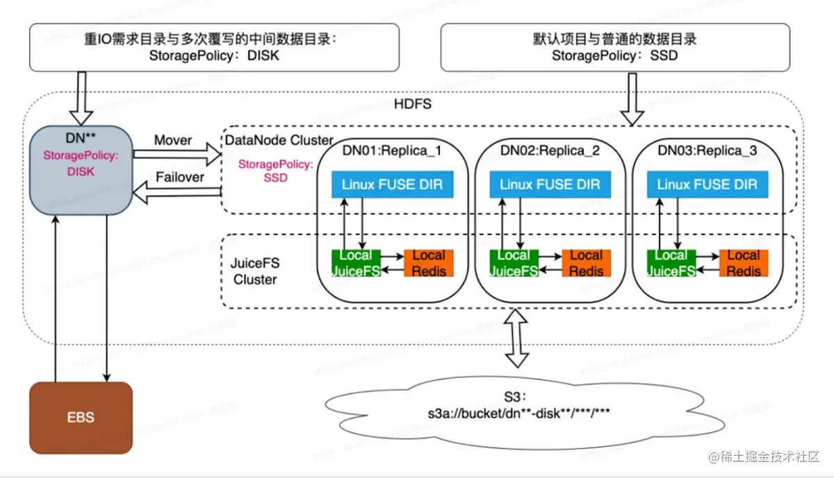 - 利用 Hadoop 异构存储的特性,根据业务特性拆解 IO,以优化性能和成本。我们将 HDFS 存储拆分为两个部分,"DISK" 和 "SSD"。"SSD" 存储类型对应的是使用 JuiceFS 的 EBS 缓存与 S3 整合的混合存储。"DISK" 存储类型被配置为写入 DN 的 EBS 存储的目录。在那些会频繁覆写的目录,例如 Stage 目录,我们会将这些目录设置成使用 DISK 进行存储。EBS 存储更适合频繁擦写,对比 S3 的少了额外 OP 费用,而且这些目录对存储的总量要求是可控的,因此这个场景我们保留了一小部分 EBS 存储。