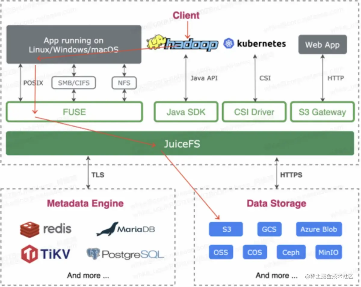 S3 的性能受限,需要分桶和随机目录等优化措施,对业务使用不透明,调整目录 prefix 去适配 S3 分区或使用更多的桶的方案都需要业务调整已有的使用方法,无法适配我们目前的目录设计。另外,作为对象存储实现的文件系统,直接对 S3 的目录进行 list 和 du 等操作在超大文件数据情况下,基本上是不可用的,但是这又恰好是大数据场景下大量使用的操作。