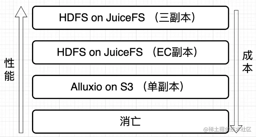 - 再次是 Alluxio on S3(低频冷数据)1 副本;