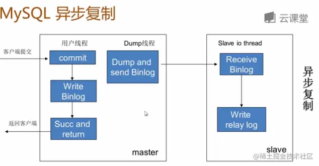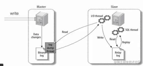 从库生成两个线程,一个I/O线程,一个SQL线程;