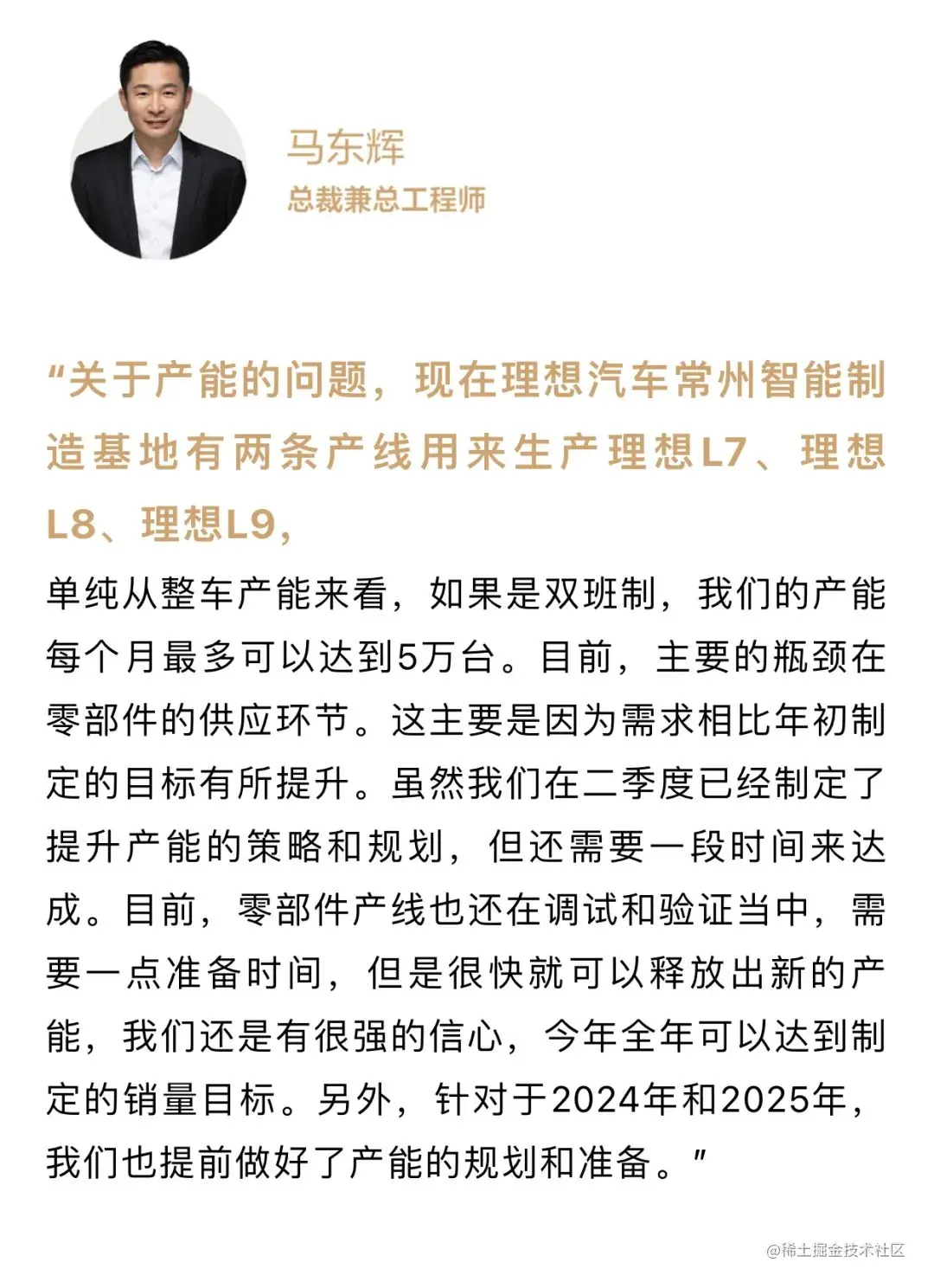 李想也曾在微博多次提及产能问题。据悉,常州工厂6月份已经达到7500辆/周的峰值产能,7月第二周的周产能会提升至8000辆/周,四季度才能实现1万辆/周的产能。本月初,理想再次重申“本季度产能是唯一的瓶颈,且本季度无解“。