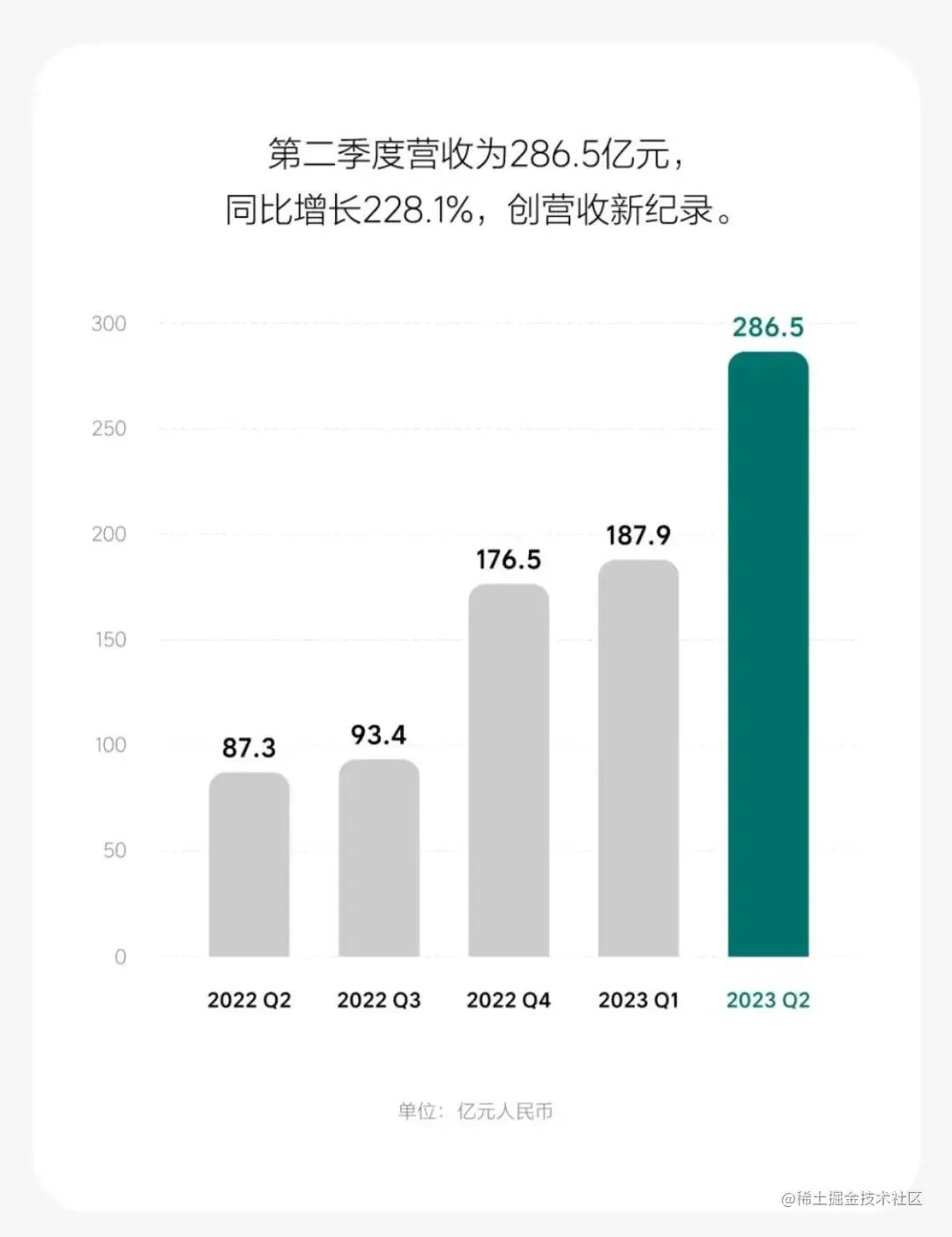 根据理想汽车8月8日公布的二季度财报,公司二季度营收达到286.5亿元,同比增长228.1%;净利润23.1亿元,环比增长147.4%;毛利润62.4亿元,同比增长232%,毛利率21.8%;经营现金流111.1亿元,同比增长10倍;新车交付量86533辆,同比增长201.6%。