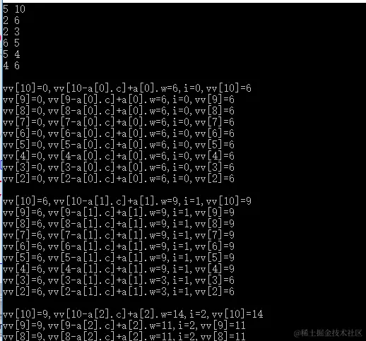printf("vv[%d]=%d,vv[%d-a[%d].c]+a[%d].w=%d,",j,vv[j],j,i,i,vv[j-a[i].c]+a[i].w);