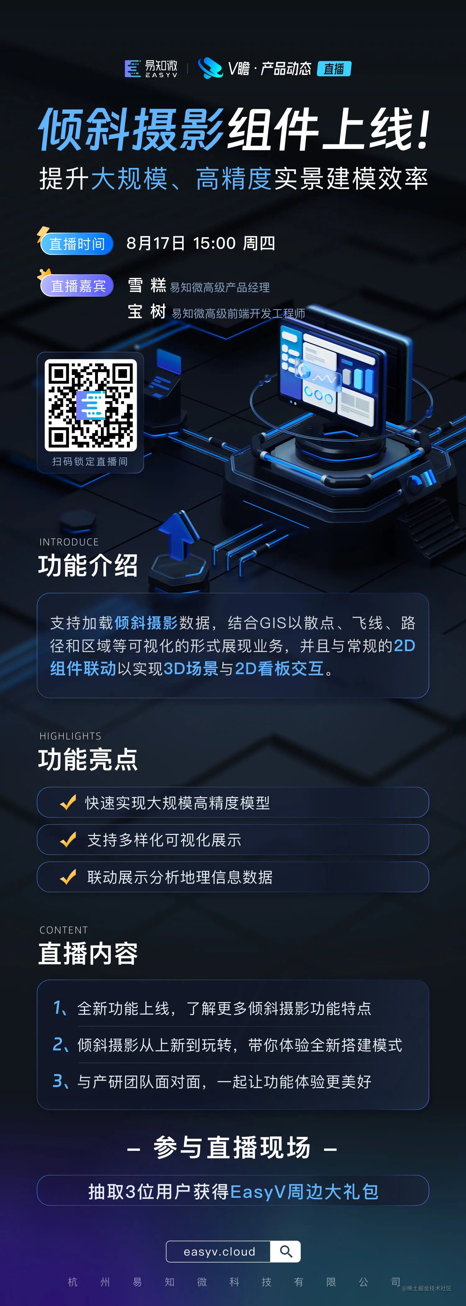 当倾斜摄影与数字孪生技术结合时,可以在多个领域创造强大的可视化和孪生应用,更好地理解和分析真实世界情景,进行模拟测试和决策支持,为各种领域的研究、规划和设计提供更精确、全面的数据支持。正因为其优势,很多用户在使用EasyV低代码数字孪生可视化平台过程中,经常会有相关倾斜摄影功能的使用需求,以此来提升高精度建模效率。因此我们将在8月16日下周三正式上线「倾斜摄影」组件功能👏。