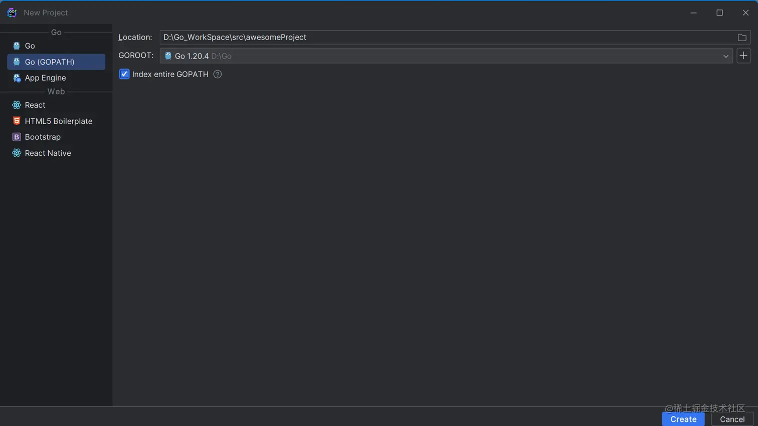 选择GO(GOPATH)→选上index entire GOPATH→create