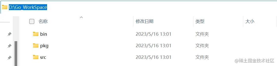 在上述GOPATH对应路径下,新建 bin、pkg、src 三个文件夹。