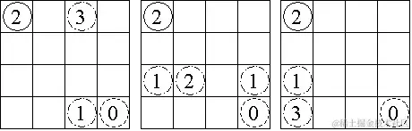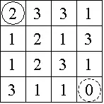 Consider the 4 x 4 board shown in Figure 1, where the solid circle identifies the start position and the dashed circle identifies the target. Figure 2 shows the three paths from the start to the target, with the irrelevant numbers in each removed.