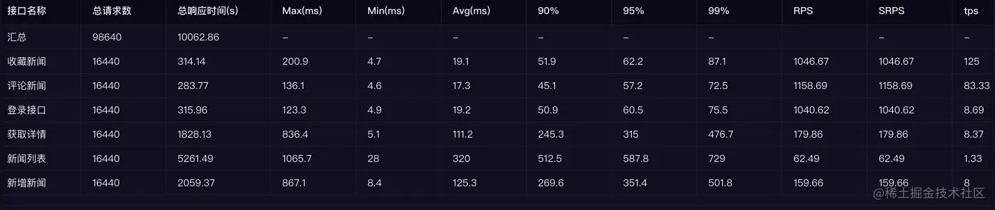 一条使用查看新闻的场景:六个接口,使用并发模式,20的并发,执行10分钟。