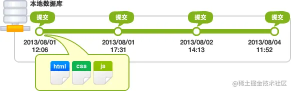 如下图,提交是以时间顺序排列状态被保存到数据库中的。凭借该提交和最新的文件状态,就可以知道过去的修改记录以及内容。