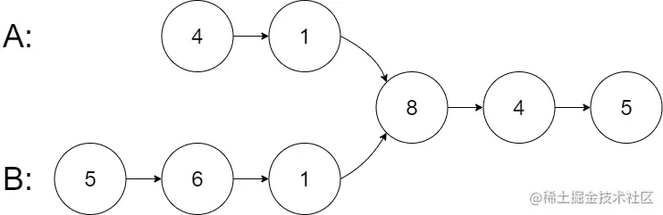 从各自的表头开始算起,链表 A 为 [4,1,8,4,5],链表 B 为 [5,6,1,8,4,5]。