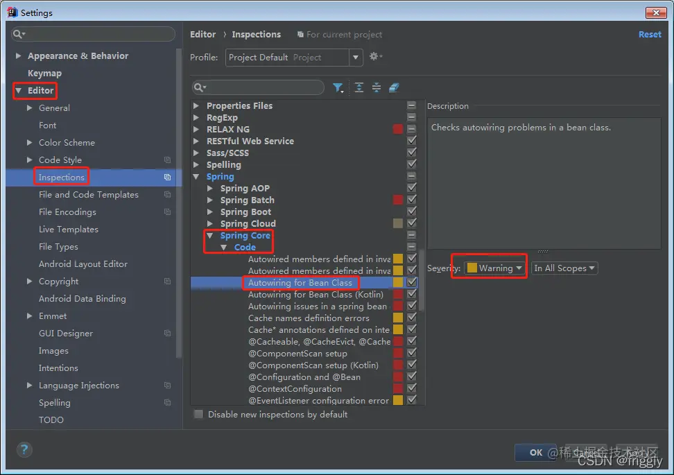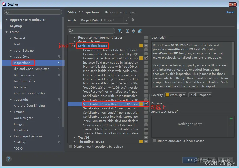 在类名上 Alt + 回车,如果没有提示生成序列化 id,那么需要做如下的配置 :