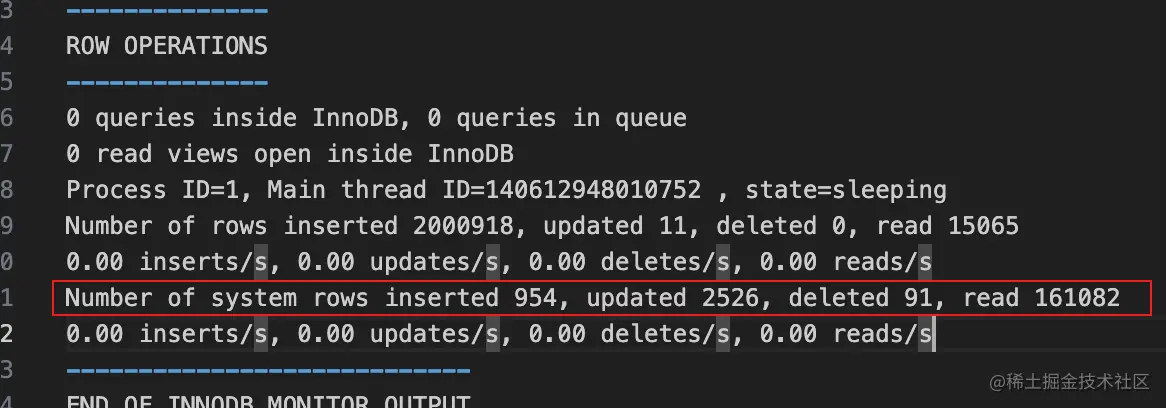 该命令会查询出MySQL Inndb存储引擎的操作情况,信息包含Innodb各种统计信息: