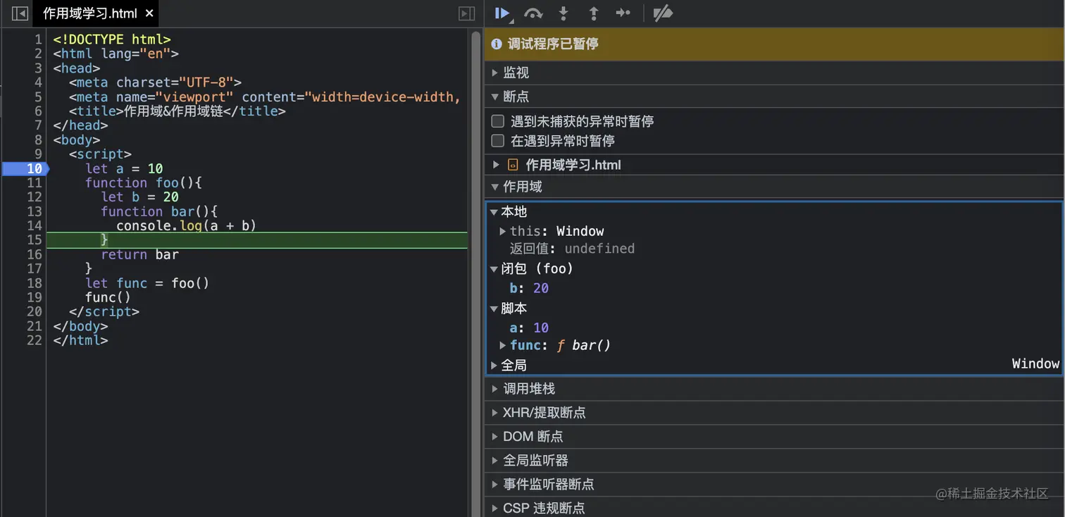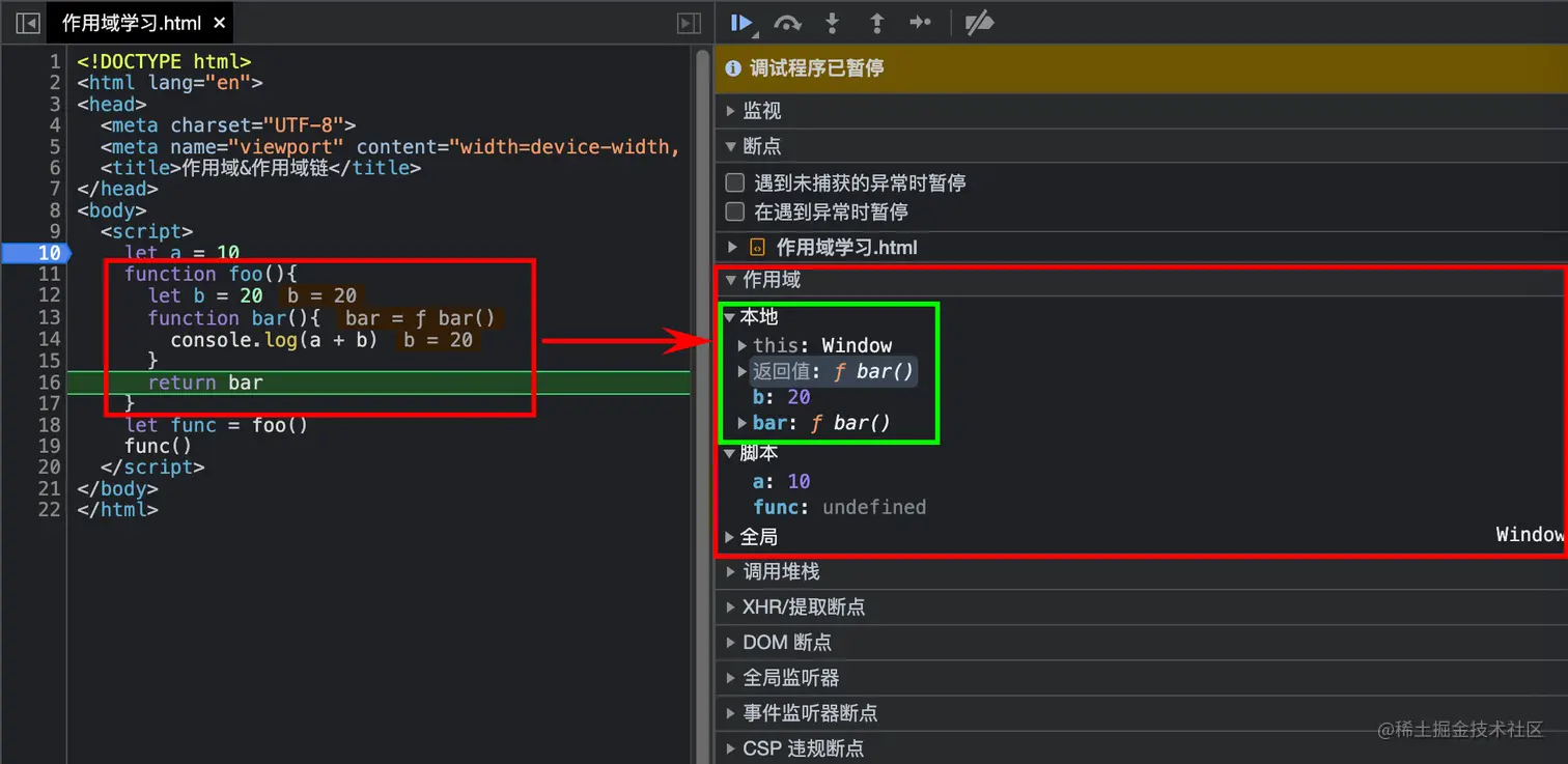foo函数后,可以作用域中的本地(Local)中看到foo函数作用域内有变量b和函数bar。 -