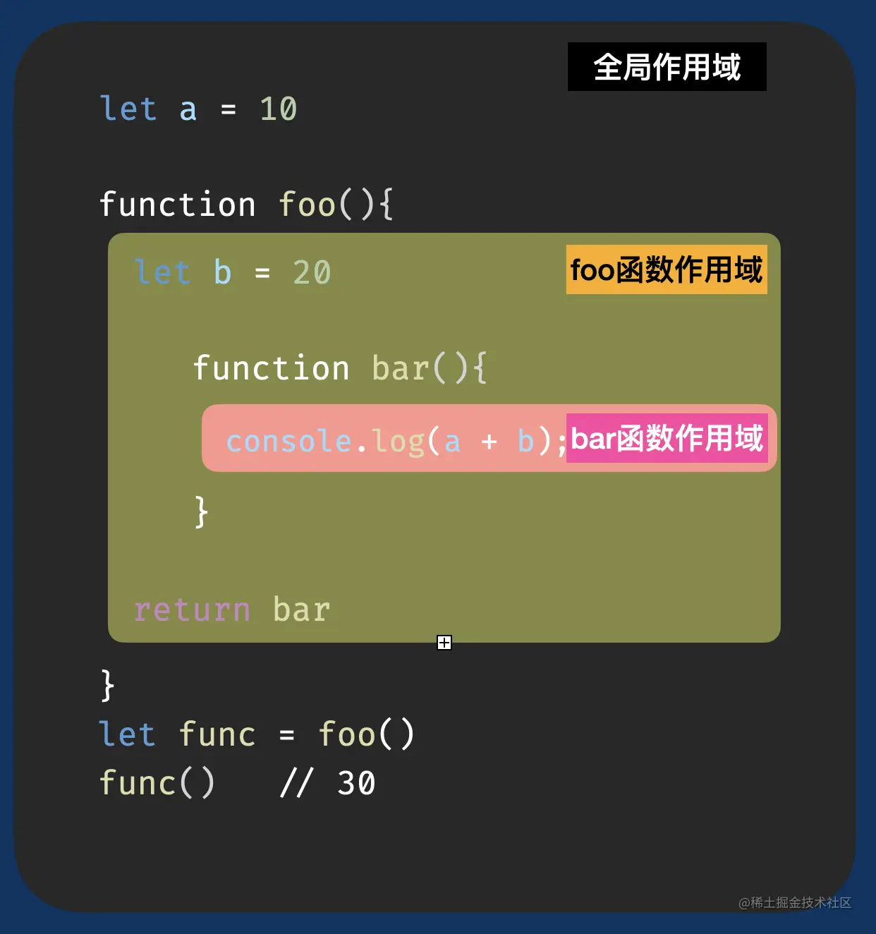 bar函数中需要用到变量a和b,a是最外层变量,foo函数产生了闭包,所以foo函数里面的bar函数可以取到函数外层的b和模块最外层变量a,要注意而这里a并不是全局变量,是当前模块文件的最外层变量,和全局变量不同,它只能被模块文件内的代码访问。