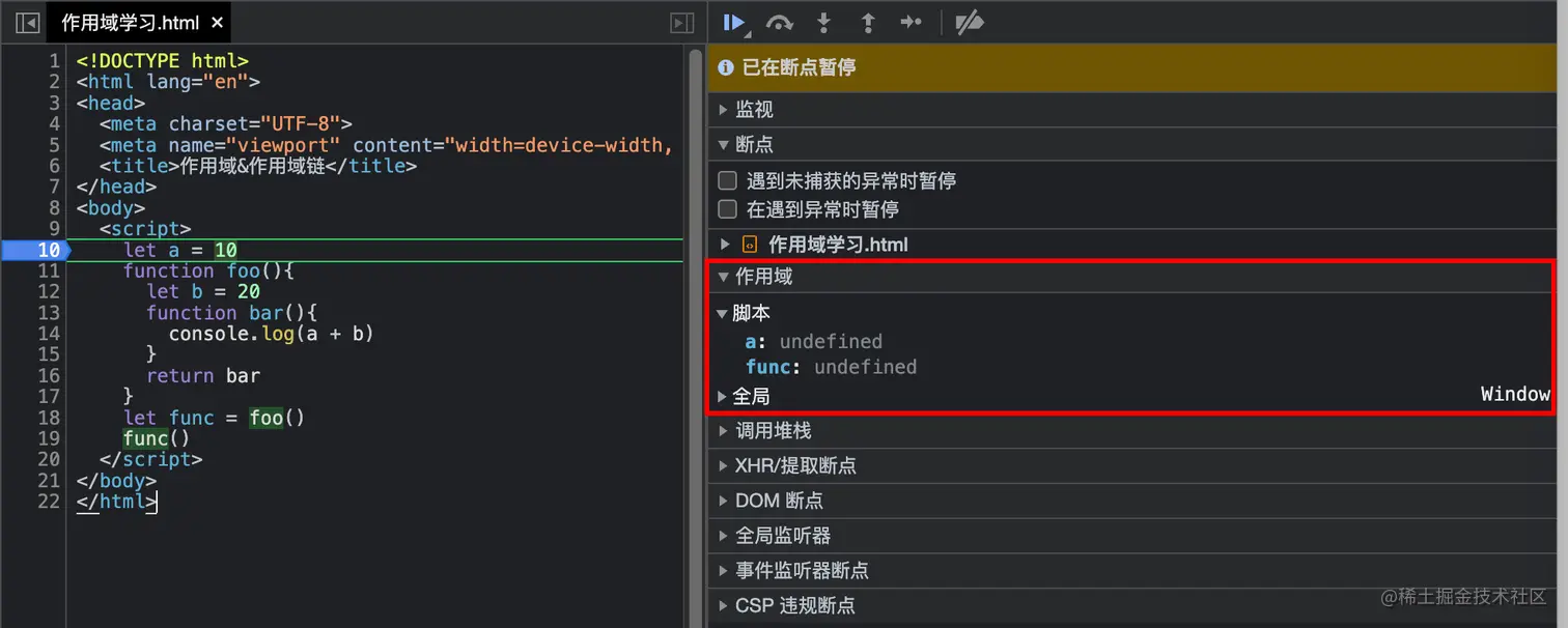 (Global)中能找到全局对象window,在脚本(Script)中能还看到变量a和func,但是二者是用let声明的,也就是产生了上面提到的暂时性死区,此时若是获取和使用a或func则会报错。 -